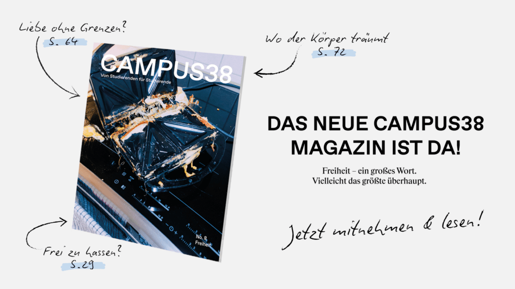 … natürlich nicht erst gestern veröffentlicht. Die aktuelle Ausgabe unseres in der Lehrredaktion Print entstandenden, von Studierenden produzierten Magazins liegt seit dem Sommer überall auf dem Campus oder auch an anderen Auslagestellen in der Region bereit. Mit viel Herz und Tiefgang hat die Campus38-Redaktion unter der Leitung von Professor Marc-Christian Ollrog erneut gemeinsam mit Mediendesign ein Magazin geschaffen, das berührt, provoziert und zum Nachdenken anregt. Vielleicht hat der oder die eine oder andere es bereits entdeckt.