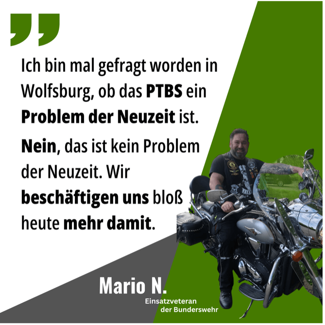 Mario N. ist Einsatzveteran der deutschen Bundeswehr. Durch seine Auslandseinsätze leidet er an einer psychischen Erkrankung, einer posttraumatischen Belastungsstörung (PTBS). Während seiner Zeit in der Bundeswehr hat er viel erlebt und war in mehreren Einsätzen beteiligt. Unter anderem als Späh-Truppführer auf dem Balkan, während des Bosnien-Einsatzes (SFOR) im Jahr 1997 in Sarajevo und im Kosovo-Einsatz (KFOR) im Jahr 2000/2001, bis in den Mittleren Osten nach Kuwait, wo er 2002 während des Einsatzes „Operation Enduring Freedom“ als Aufklärungssoldat der Bundeswehr zum Schutz der dortigen ABC-Abwehrtruppe eingesetzt wurde.